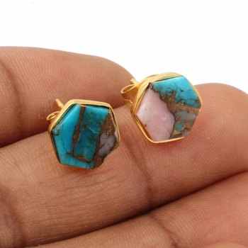 Genuine Solid 925 Sterling Silver 10mm Pink Opal Copper Turquoise Hexagon Shape 18k Gold Filled Stud Handmade Earring for Women