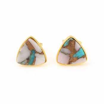 Handmade Copper Turquoise & Natural Pink Opal Trillion Cut Sterling Silver Gemstone Fine Stud Earrings Gold Plated Fine Jewelry