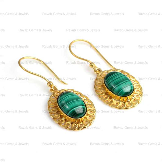 18K Gold Plated Beautiful 10x12mm Natural Green Malachite Bezel Setting Fine Dangle Oval Drop Earrings for Women Made Sterling