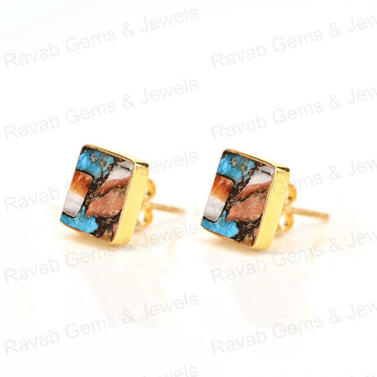 High Quality 925 Sterling Silver Fine Stud Earrings Handmade Mohave Spiny Oyster 12mm Square Bezel Stud Flat for Women