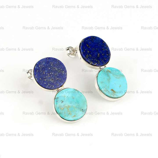 Top Selling 10mm Turquoise & Lapis Lazuli Coin Gemstone Stud Earrings Genuine 925 Sterling Silver Unisex Fine Jewelry for Women