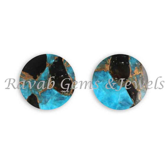 Black Blue Copper Turquoise Round Coin Shape 12mm Flat Gemstone For Jewelry Making, Loose Beads Calibrated Stone For Jewelry 2 Pcs Set