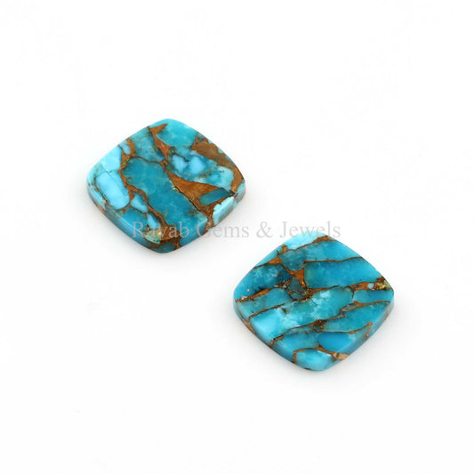 Blue Copper Turquoise Cushion Shape Smooth Flat Gemstone, Loose Beads Calibrated Stone For Fancy Jewelry Earring Making - 2 Pcs Set