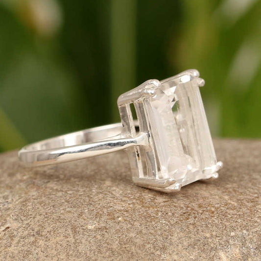 Best Selling Genuine White Clear Crystal Quartz 10x14mm Baguette Shape Solid 925 Sterling Silver Double Prong Set Women Ring