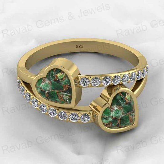 Best Selling Genuine 925 Silver Mohave Peridot Copper Gemstone With CZ Bezel Double Band Couple Heart Ring for Valentine Jewelry