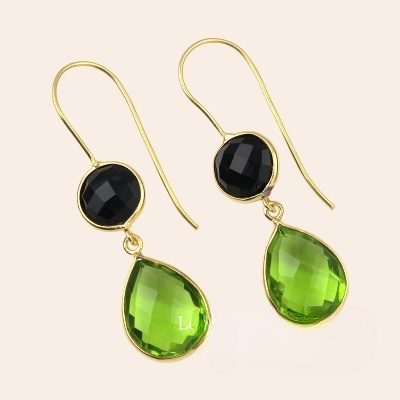 Best Selling Solid 925 Sterling Silver 18k Gold Plated Peridot & Black Onyx Drop Dangle Checker Cut Bezel Setting Fine Earring