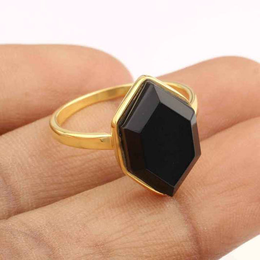 Best Selling Sterling Silver Non Tarnish Nickel Free Jewelry 18k Gold Plated 8x16mm Hexagon Cut Dainty Black Onyx Ring for Her