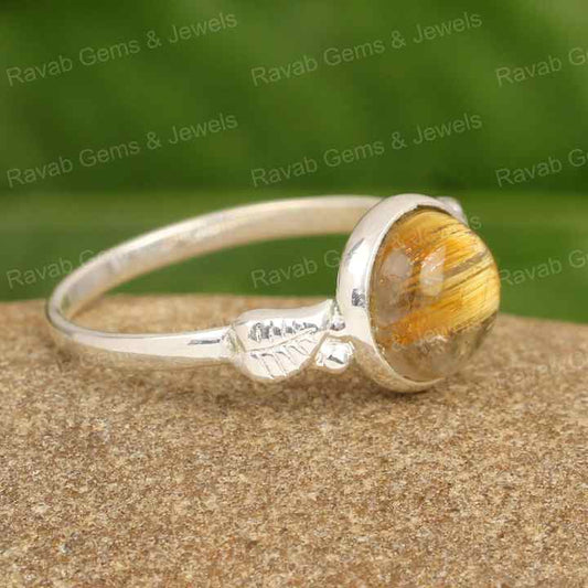 High Quality 10mm Solid 925 Sterling Silver Women's Engagement Rings Natural Golden Rutile Cabochon Leaf Designer Style Direct