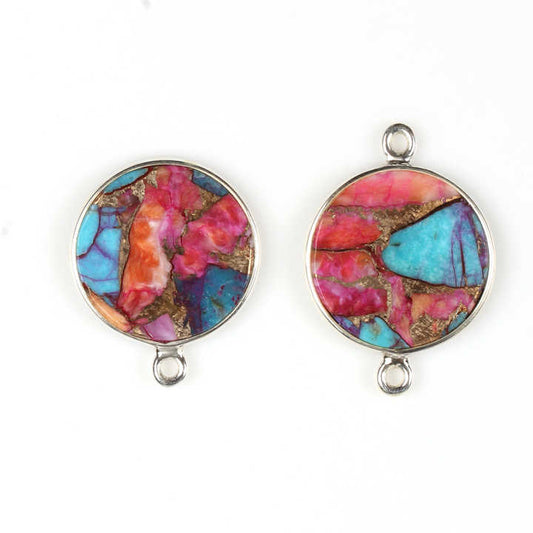 12mm Round Coin Pink Opal Copper Turquoise Composite Gemstone Bezel Silver Charms Connector Pendant for Necklace & Bracelet