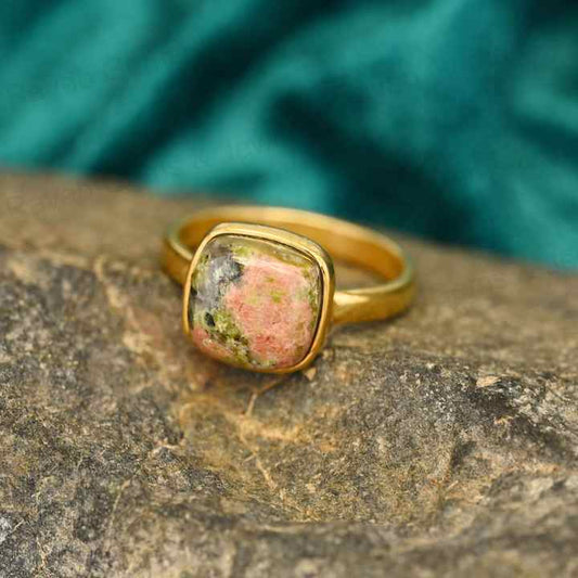 Hot Selling Solid 925 Sterling Silver Natural Unakite Cushion Shape 12mm Bezel Setting 18k Gold Filled Fine Ring for Women
