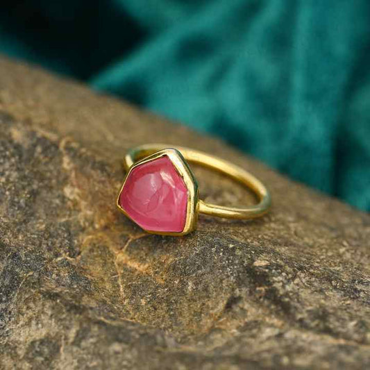 Latest Design 12x14mm Natural Pink Strawberry Quartz Gemstone Bezel Handmade 18K Gold Plated Silver Dainty Fancy Ring for Her