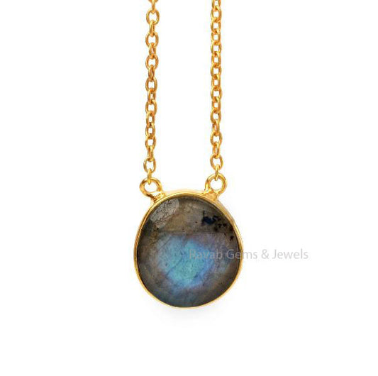 Madagascar Blue Flashy Labradorite, 12mm Organic Shape, 925 Sterling Silver, Gold Plated Bezel, Long Cable Chain Necklace, Lobster Clasp