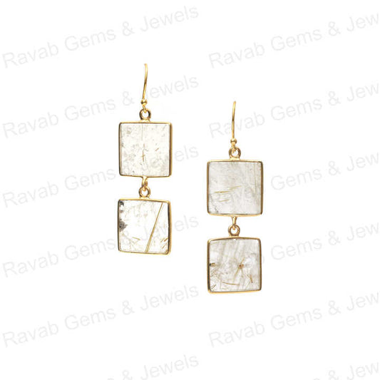 Superb Solid 925 Sterling Silver 10mm Natural Golden Rutile Square Flat Smooth 18k Gold Plated Dangle Drop Earring for Women