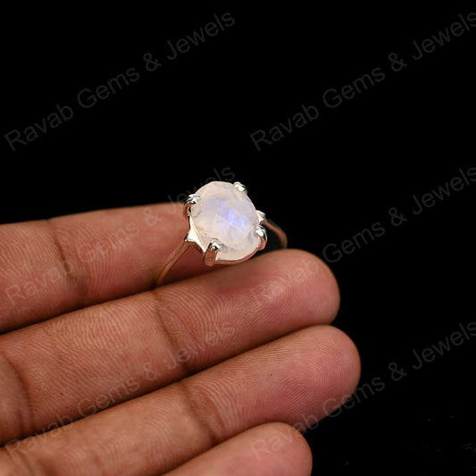 Superb Solid 925 Sterling Silver Natural Rainbow Moonstone Oval Checker Cut Prong Setting Ring for Women Fine Handmade Jewelry