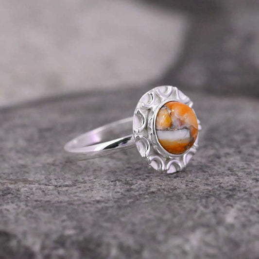 Superb Quality Solid 925 Sterling Silver Natural Orange Spiny Oyster Turquoise 10mm Round Shape Ring For Women Fine Jewelry