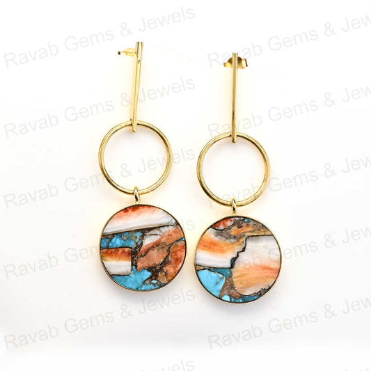 Top Quality Solid 925 Sterling Silver 10mm Natural Spiny Oyster Round Flat Smooth 18k Gold Plated Dangle Drop Earring for Women
