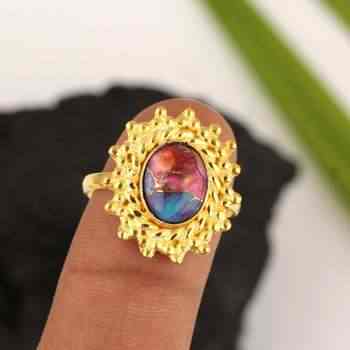Top Selling 10x14mm Mohave Turquoise Pink Opal Copper Gemstone Bezel 18k Gold Plated Sterling Silver Dainty Oval Ring for Women