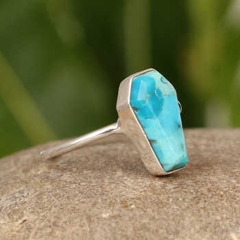 Top Selling Dainty Coffin Shape Sterling Silver Ring Genuine Kingman Blue Arizona Turquoise Gemstone Bezel Setting Women's Fine