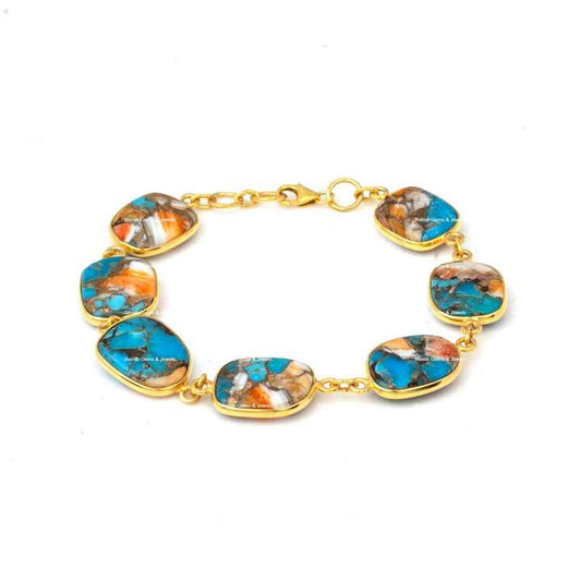 Beautiful Natural Mohave Spiny Oyster Copper Turquoise Sterling Silver Gold Plated Chain Adjustable Uneven Bracelet for Women