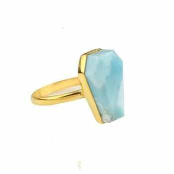 Beautiful High Polish Gold Plated Silver Coffin Shape Ring 10x17mm Natural Dominican Sky Blue Larimar Gemstone Jewelry for Women