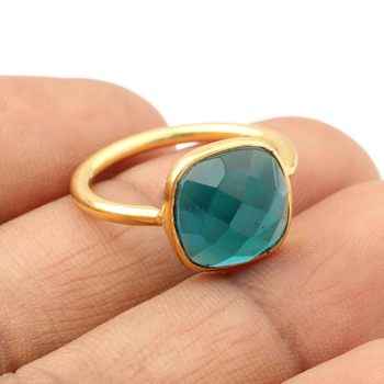 Best Quality 925 Sterling Silver 18k Gold Plated Green Teal Sapphire Hydro Cushion Checker 12mm Ring for Women Handmade Jewelry