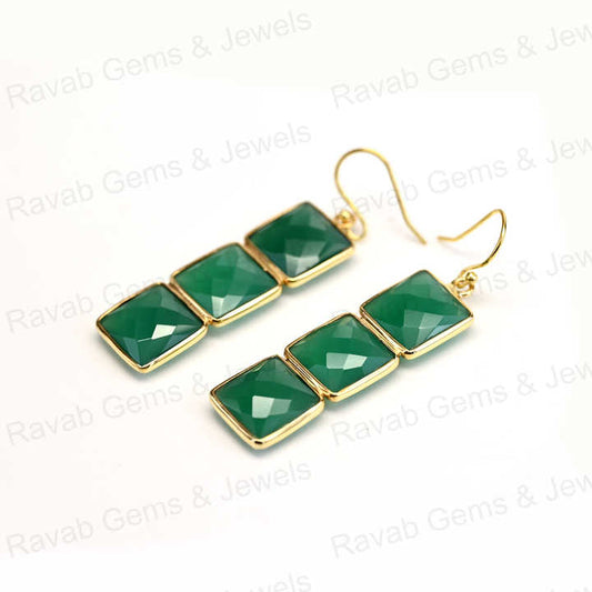 Best Quality Solid 925 Sterling Silver 10mm Natural Green Onyx Square Checker Cut 18k Gold Plated Dangle Drop Earring for Women