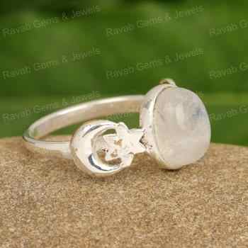 Best Quality Genuine White Rainbow Moonstone Oval 10x14mm Solid 925 Sterling Silver Moon & Star Design Women Handmade Ring
