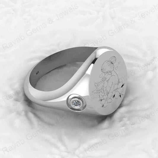 New Arrival Solid 925 Sterling Silver Engraved Style CZ Mother Holding Baby Signet Ring for Men's Fine Handmade Jewelry