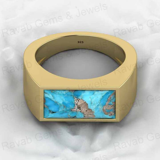 Top Selling Genuine 925 Silver 7x14mm Rectangle Pyrite & Turquoise Gemstone Bezel Sating Signet Ring for Men Wedding Jewelry