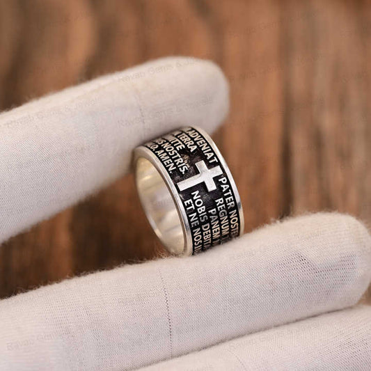 Top Selling Handmade 925 Silver Wide Band Spiritual Catholic Prayer Cross Christ Embossed Men's Ring Christian Fine Jewelry