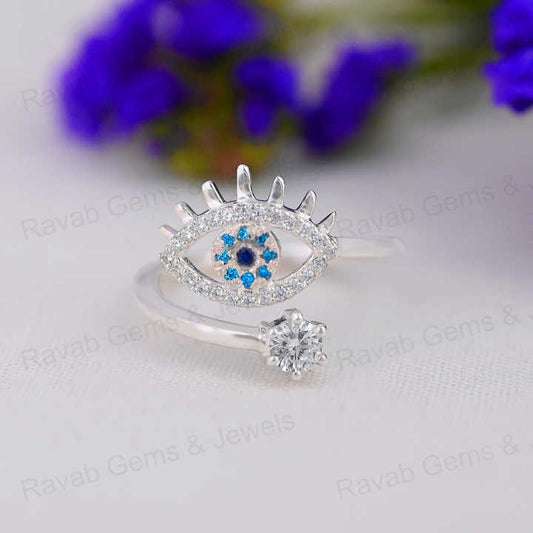 Best Selling Handmade 925 Sterling Silver Pave Zircon Lucky Eye Turkish Adjustable Prong Women Ring Minimalist Fine Jewelry