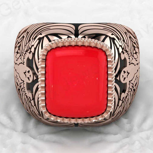 Best Selling Solid 925 Sterling Silver Smooth Red Coral Octa Cushion Shape Signet Ring for Men Customized Handmade Jewelry