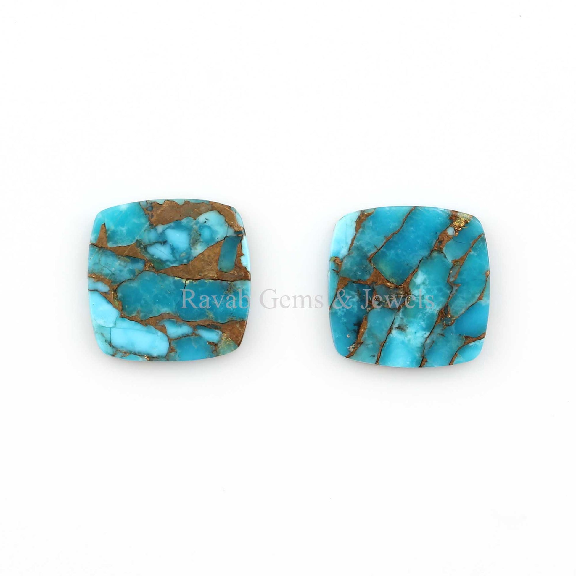 Blue Copper Turquoise Cushion Shape Smooth Flat Gemstone, Loose Beads Calibrated Stone For Fancy Jewelry Earring Making - 2 Pcs Set
