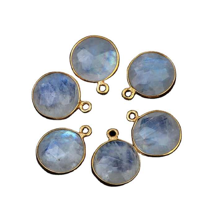 Natural Rainbow Moonstone 12 MM Round Shape Sterling Silver Gold Plated Bezel Charm Pendant