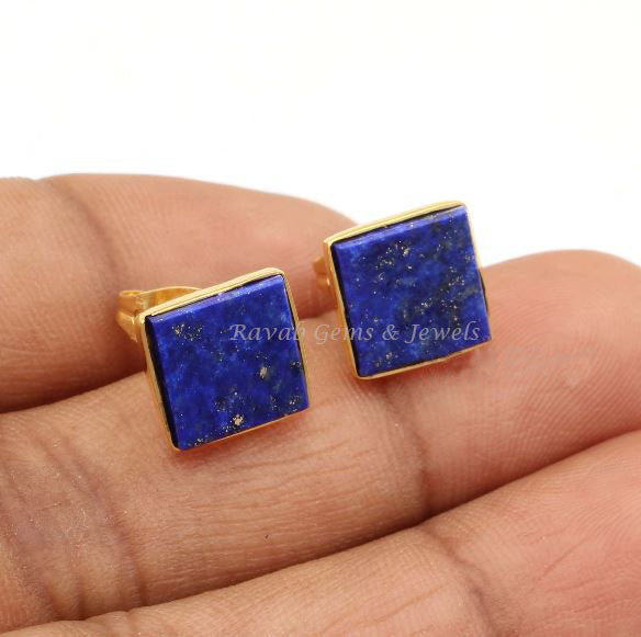 Lapis Lazuli Square Gemstone Stud Earrings, Gold Plated 925 Sterling Silver Earrings, Smooth Flat Calibrated Stone Stud Earring For Gifted