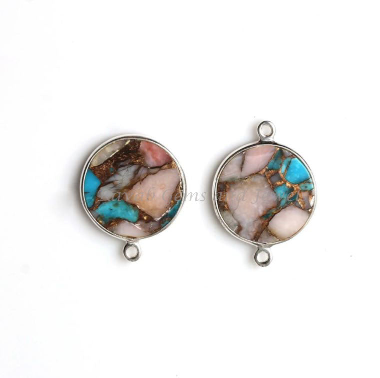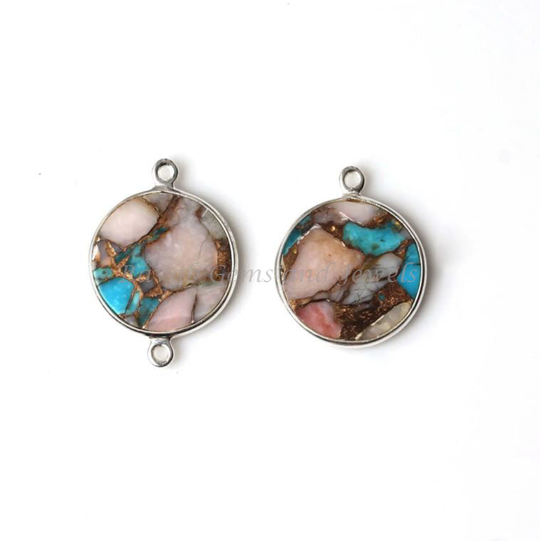 Pink Opal Copper Turquoise Round Smooth Flat Gemstone Gold Plated 925 Silver Charm Or Connector, Lovable Pendant Charm For Gifted 1 Pc 12mm