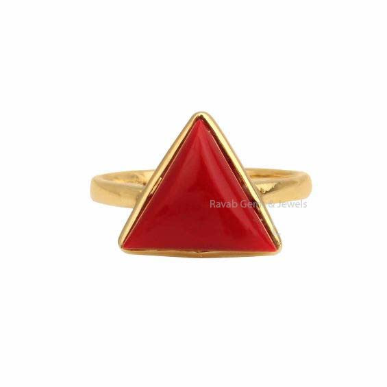 Red Coral Gemstone Ring, 925 Sterling Silver Gold Plated Ring, 12mm Triangle Shape Smooth Cabochon Stone Ring, Trendy Ring Gift For Her