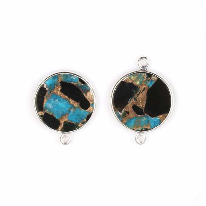 Top Selling Genuine 925 Sterling Silver Mohave Blue Black Copper Turquoise Gemstone 12mm Round Coin Shape Bezel Charm Connector